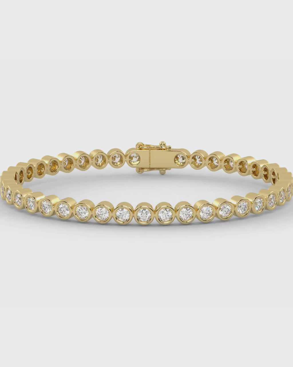 Hand-set in a sleek bezel setting, with 4.16 total carats of D Colour, VVS Clarity moissanite, this 4.4mm sterling silver/ vermeil tennis bracelet rivals natural diamonds.